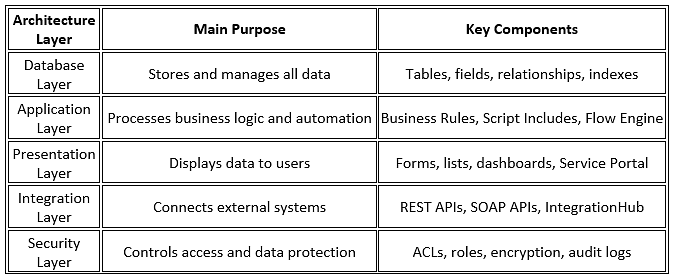 The database layer is the foundation. It stores all records. Records include incidents, users, assets, and approvals. ServiceNow uses a relational database. Tables store data in rows and columns.